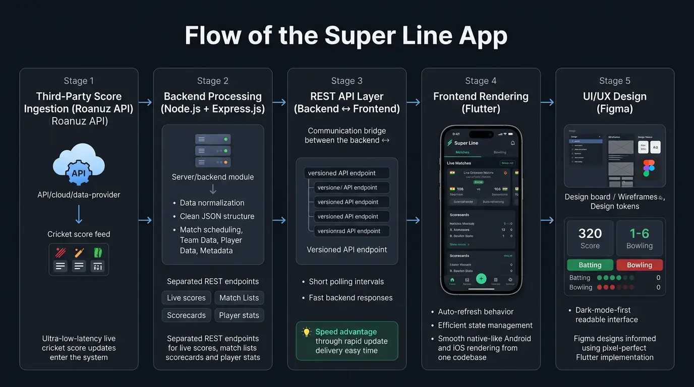 The Speed Advantage: The key differentiator of Super Line is its polling architecture. The backend fetches from Roanuz at an optimised frequency, processes the data instantly, and makes it available via REST endpoints. The Flutter app polls these endpoints at a short, consistent interval. The combined latency of this chain is significantly lower than the update delays observed in mainstream cricket apps. In user testing, Super Line consistently displayed score updates 8–15 seconds ahead of Cricbuzz on the same network.